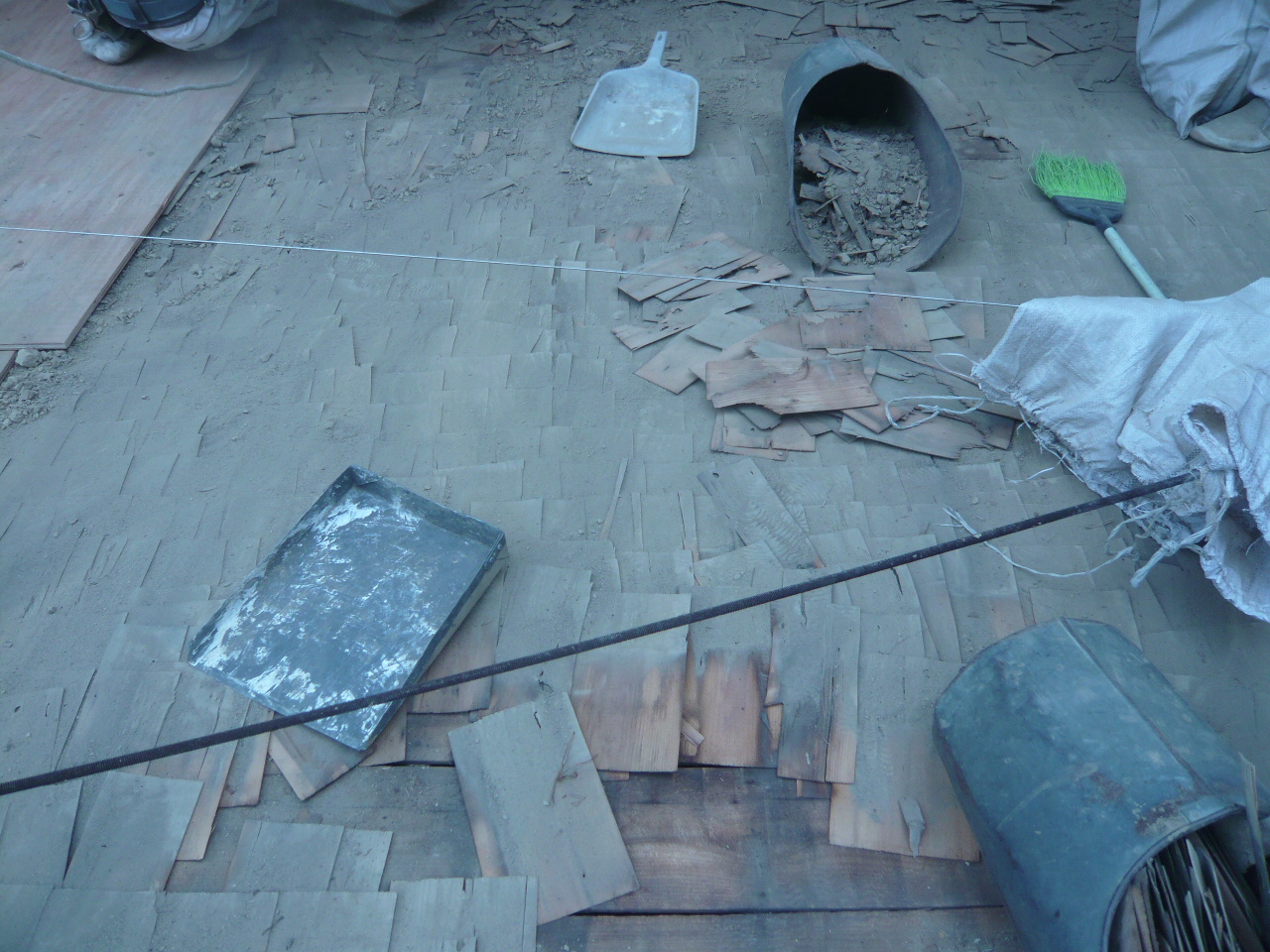 瓦をめくり、土を取り除くと下地にとんとん葺下地が現れた。