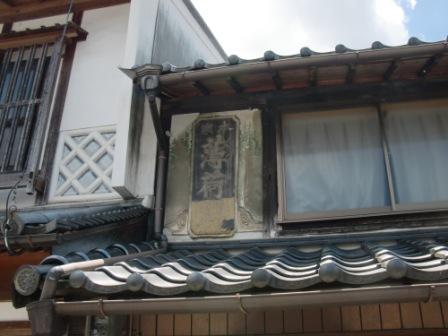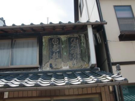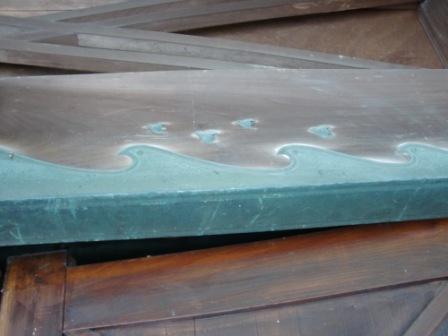 津山城近くで見かけた門の桁下端に付けられていた飾りの銅板、鳥が飛んでる遠くから見ると海面をトビウオが飛んでるように見える。
