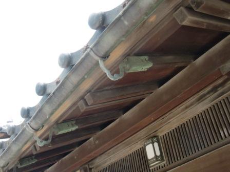 玄関門の軒樋金物、吹き寄せの垂木の1本の所から垂木の鼻先を銅板で包み正面打ちの銅製受け金具を取り付けている。ちょとしたことだが、かなり手間はかかるし費用もかかるだろう。