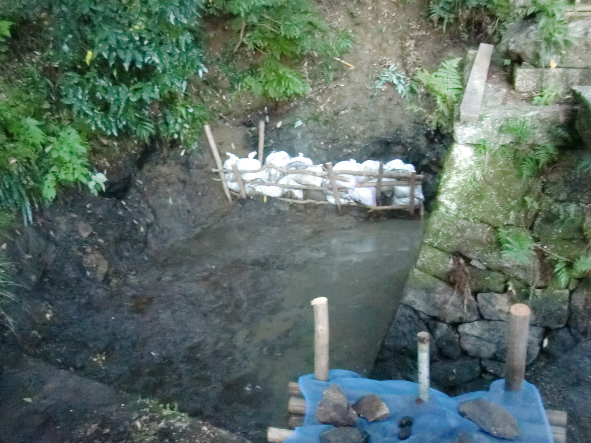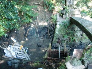 10年ぶりの掃除で、落ち葉と泥の量ははんぱな量ではない。総勢20人でバケツリレーでやると約3時間で綺麗になった。バケツに約500杯位あったやろな。
